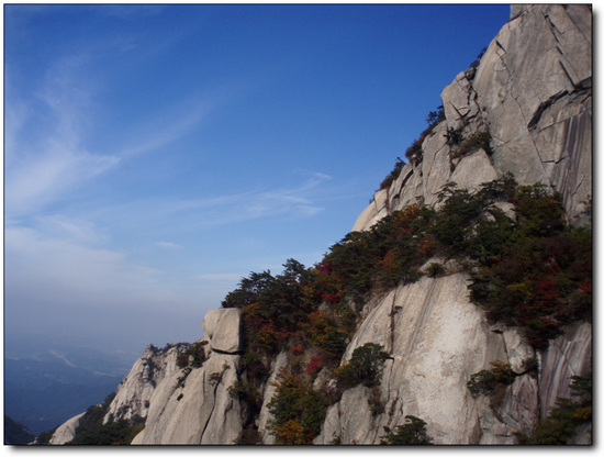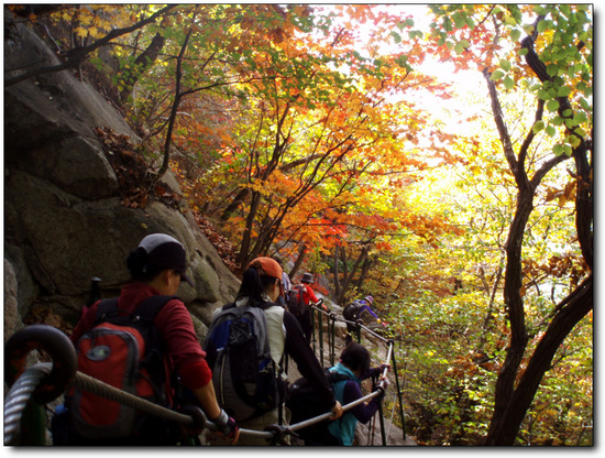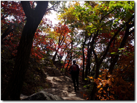 북문을 지나 위문 오름길에 간간이 보이던 단풍은 위문에서 용암문구간에 이르러 절정을 이른다.