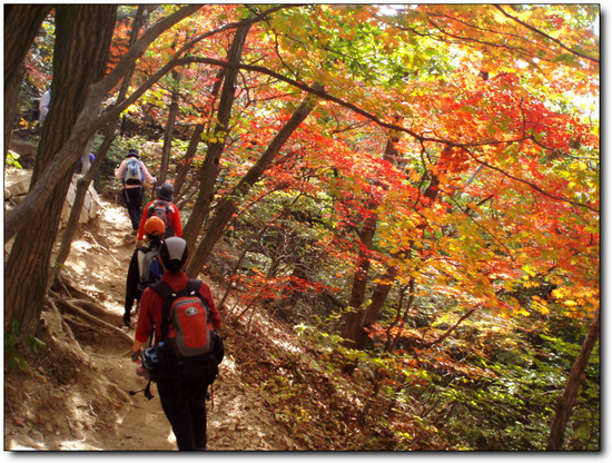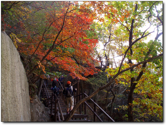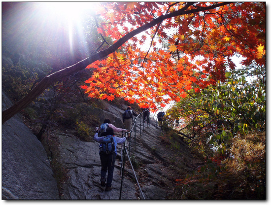 모두들 감탄사를 연발하는 우리님들,피빛으로 물들은 단풍에 현혹되어 좀처럼 진행이 안된다.