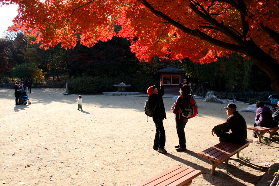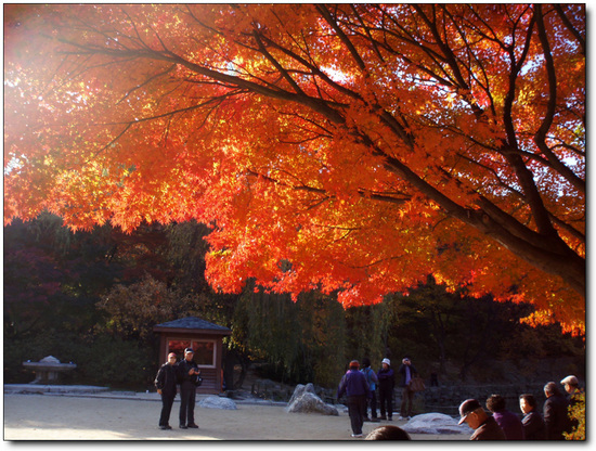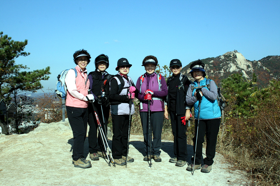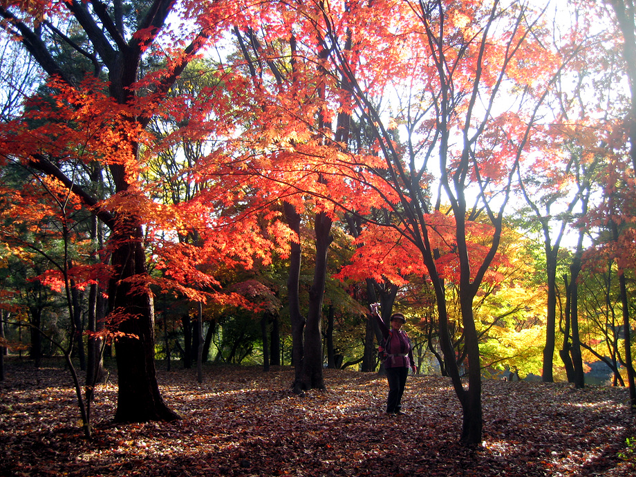 2008년 11월10일 월요일 맑음(삼각산과 고궁나들이) 코스=구기터널약수터-탕춘대능선-향로봉우회-구기동-종묘-창경궁 함께한님=산내음 산이슬 들꽃 착한님과은영부부 운해 물안개(7명) 매년 산정에 단풍이지고, 도심으로 내려오면 꼭 한번은 다녀오는코스, 산과 고궁을 연계 산행을한다. 어제저녁 은영부부의 딸 결혼식 치루느라 힘들었을텐데.... 오늘 우리아지트산행에 점심 산다고 부부가함께 한다. 어제 비가 조금왔다고 오늘 날씨는 맑고 청명한 전형적인 가을날씨다. 늘 서울하늘이 스모그현상으로 뿌연하늘이었는데.....얼마만에 보는 파란하늘인가? 불광역에서 만난 우리님들 구기터널약수터를 지나 길게 이어지는 탕춘대능선으로 올라서니. 싸한바람과 삼각산의 멋진자태가 한눈에 들어온다. 눈이 시리도록 파란하늘 그리고 흰구름...너무 멋지다. 오늘따라 족두리봉과 향로봉이 더 아름답게 느껴지는건 파란하늘 때문이리라..... 암릉을 지나 향로봉 한자락 따스한커피와 간식으로 요기를하고 구기동으로 하산한다. 구기동 깔끔한 식당에서 은영부부가 낸 점심을 먹고, 버스로 종묘로향한다. 종묘입구에는 늘 노인들이 북적인다. 종묘로 들어서니, 은행나무 단풍나무 곱게물들어 가을의 정취를 물씬풍긴다. 종묘를지나 창경궁까지 ,올 가을가뭄이 심해 제대로된 단풍을 보지못했는데.... 이곳은 단풍이 정말 곱게 들어 여심을 자극한다. 자연이 빚어낸 고운색채 ... 햇살을 머금은 오색단풍의 향연에 우리님들 넋을 잃는다. 창경궁 한바퀴돌고 다시 종묘로 이동 고궁나들이를 마감하고 각자의 일상으로 돌아간다. 아마 올 마지막 단풍이 아닐까? 생각된다.