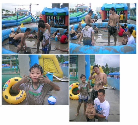 같이 간 시동생과 울 신랑과 울 동생은 벌써 자리를 잡아서 머드랜드 안에서 다른 팀과 축구도 아닌 배구도 아닌 이상한 시합을 하고 있더라구요. 경기장이 조그맣게 만들어져 있던데 거기서 막 열내면서 시합을 하는데 비가 온뒤라 그런지 사람들이 잘도 미끄러지더라구요. 그런데 ...미끄러지는것 까지는 좋았는데, 글쎄 우리 신랑이 미끄러졌지 뭐에요. 그냥 미끄러지면 다시 일어나면 되는데..미끄러지면서 바지를 홀라당 벗어버렸지 뭐에요. 순간 저는 너무 당황스러웠습니다. 일부러 벗은것은 아니지만 그래도 바지를 제대로 입던가..안그래도 엉덩이가 보일랑 말랑 해서 참 위태로웠는데 미끄러지면서 그 마찰에 의해서 바지가 홀라당 벗겨 진거에요~! 엉덩이만 홀라당 벗겨지면 애교라고 봐주면 되는데 이거야 원..전체가 다 벗겨져 버려서 그 민망함을 어떻게 표현을 못하겠더라구요. 울 신랑도 당황스러웠는지 얼릉 옷을 입긴 입었지만 이미 일은 벌어졌고 볼사람은 다 봤겠지요. 그나마 미니 경기장 안이라 천막같은걸로 약간 가려지긴 했지만 그래도 못볼것을 보여줬잖아요. 저같으면 창피해서라도 그냥 나올텐데 무슨 승부욕이 그렇게 강한지 또 축구도 아닌 배구도 아닌 정체불명의 경기를 계속 이어나가는 것입니다. 그나마 아무 일 없이 많은 사람들이 울 신랑의 거시기를 못봐서 천만다행으로 여기고 전 우리 아들이랑 머드 잔뜩 묻히면서 놀았답니다. 그런데 날씨가 또 요동을 치더니..또 비가 내리는 겁니다. 저는 속으로 앗싸 하면서 대형미끄럼틀로 막 달려갔답니다. 저같은 사람들이 참 많더라구요 비가 오니 공짜라는 생각에 사람들이 대형미끄럼틀로 또 모여드는거에요. 처음 탈때는 울 신랑한테 우리 아들 맡겨 놓고 탔는데 이젠 이상한 무슨경기 하느라 아이를 맡길수가 없는거에요.r그래서 할수 없이 제가 안고 타기로 결정을 했답니다. 울 아들도 얼마나 좋아하는지 정말 꺄르르르 웃고 난리가 난거에요. 또 타자고 그러는데 줄이 꽤 벌써 길어져 있더라구요.