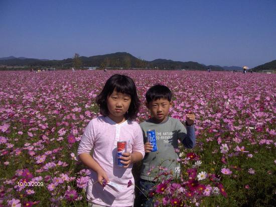 드넓은 코스모스 밭에 사이좋은 아이들.