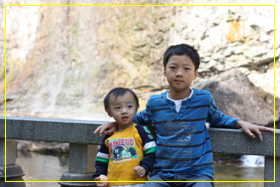 인공폭포 앞에서 큰아이와 작은아이