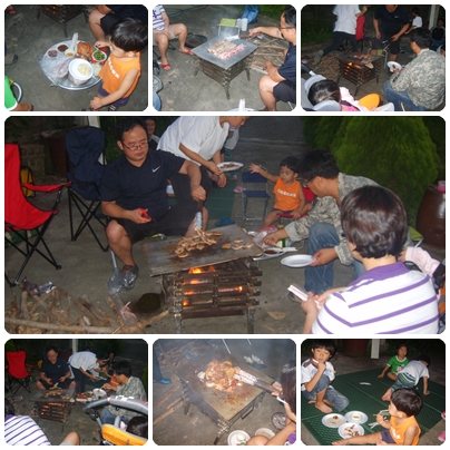 오랜 만에 만난 가족들과 마당에서 즐거운 삼겹살 파티