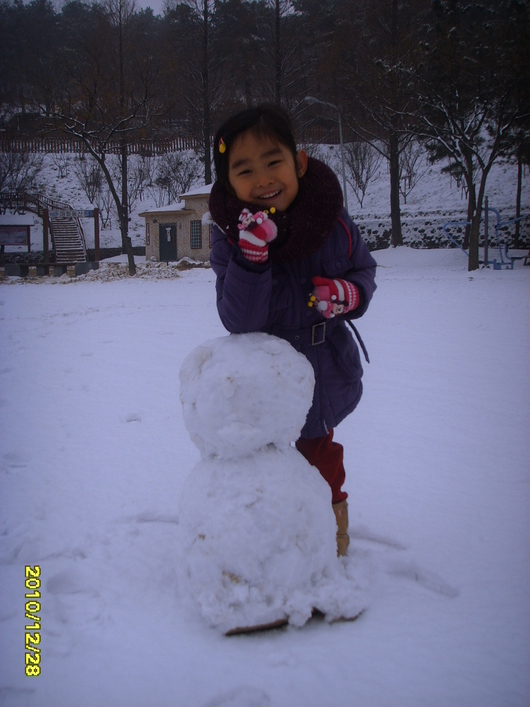 많은 눈이 내린 날 넓은 운동장에 나가서 눈싸움도 하고 눈사람도 만들면서 딸과의 행복한 추억 하나를 만들었습니다