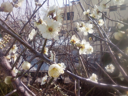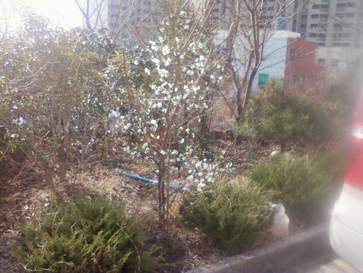그렇게 앙상하던 화단에 새하얀 매화꽃이 피었네요.