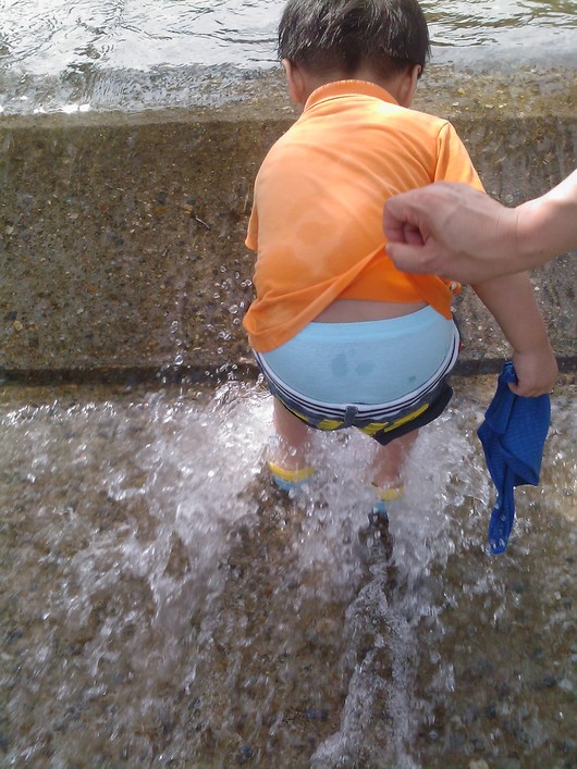 그러다가 잠시 멈춰서서 물속에 손을 넣고 돌을 잡으려고 하는데 반바지가