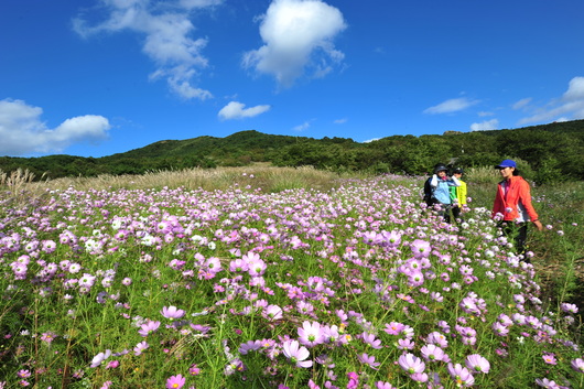 코스모스가 흐드러지게 핀 가을 등산로입니다.