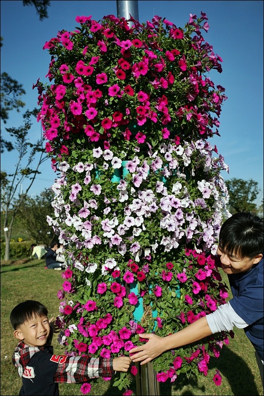 기둥에 꽃으로 장식해 놓아서 아들이랑 팔길이도 재어보았지요.