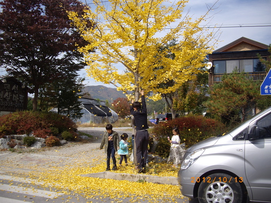 강원도 평창 여행중이에요... 은행잎밟기에 열중인 아이들...나무를 흔들어보네요~.
