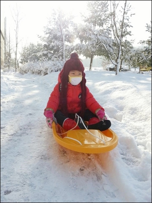 눈 내린 다음날에는 이렇게 늘 눈썰매를 타고 등원을 한답니다.