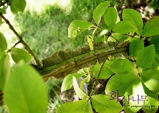나뭇가지가 화살의 날개 모양을 닮은, 화살나무. 어린가지를 보호하기 위해 얇은 코르크가 세로로 줄줄이 붙어있어요. 이 코르크 날개는 한약재로도 쓰인답니다. 가을이면 빨갛게 단풍이 들지요.