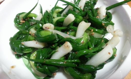 쪽파를 데쳐서 참기름과 깨소금, 약간의 소금으로 무침했어요.