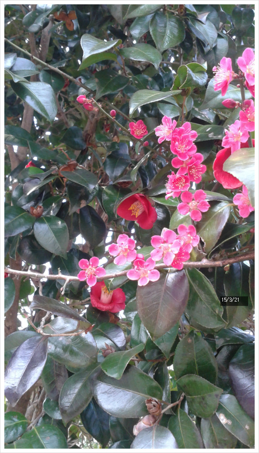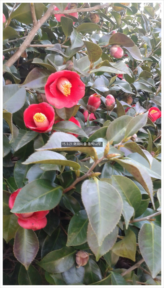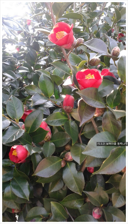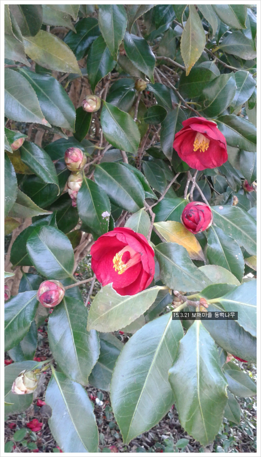해남의 동백꽃이죠 요즘 남녁은 동백꽃이 꽃모가지채로 떨어져서 붉은 융단을 만들고있을터인데 떨어지는 동백꽃도 아름다울거에요